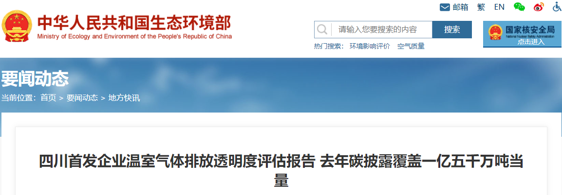 △ 生态环境部网站转载四川发布的全国首份省级企业温室气体排放透明度评估报告报道。